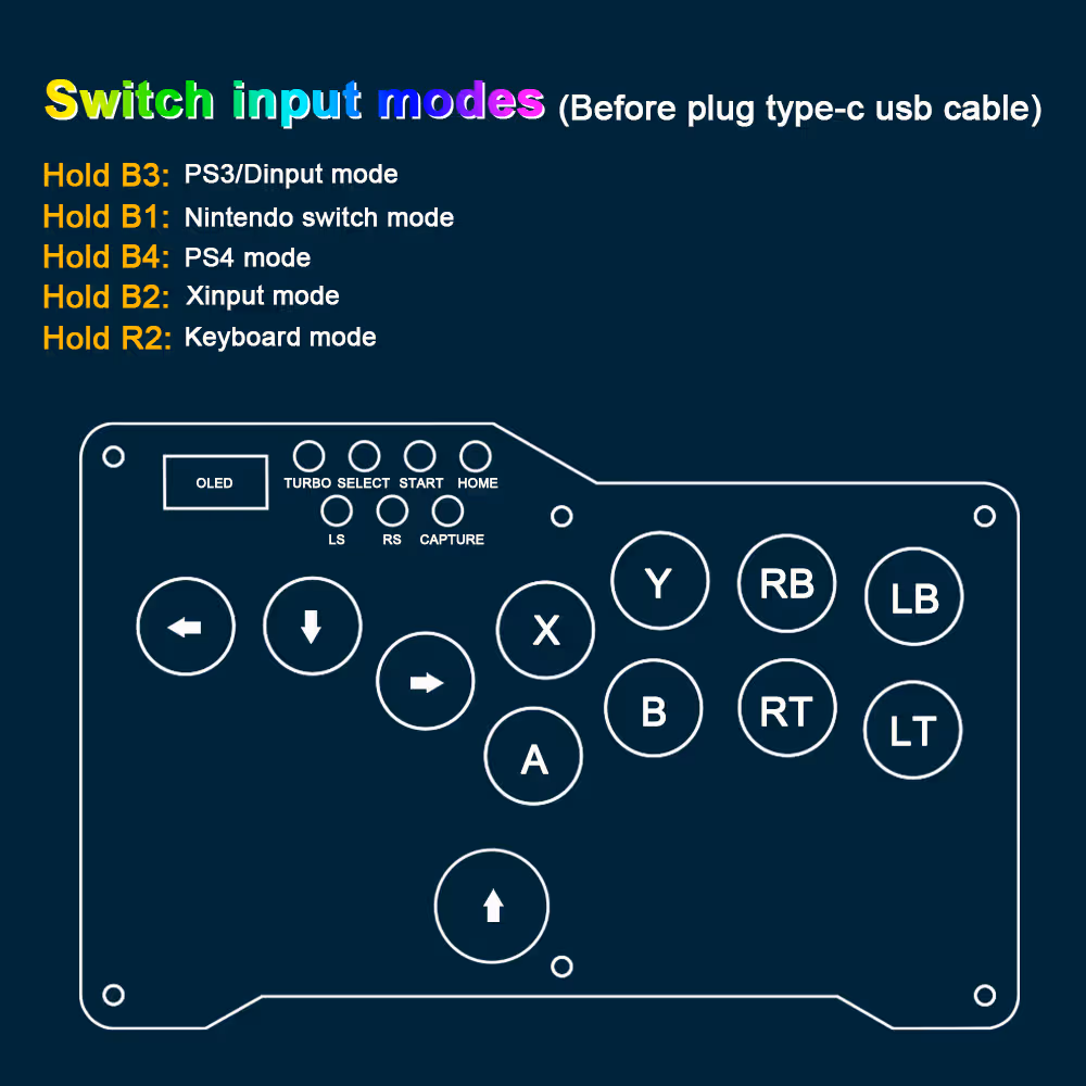 - Unterstützt verschiedene Input-Modi: XInput / Nintendo Switch, PS3/PS4 und Tastatur.
